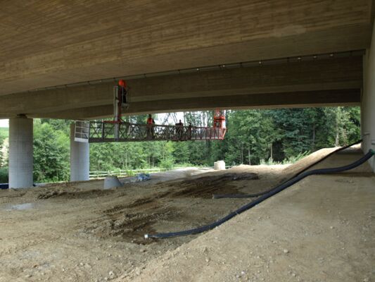 - Fahrbahndeck aus Stahlbeton, wirtschaftlich auf Traggerüstkonstruktion hergestellt